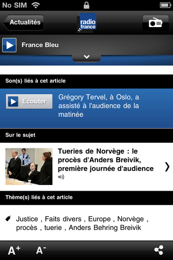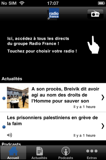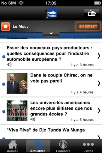 Grâce à l'application gratuite Radio France pour iPhone et iPod Touch, vous pouvez accéder à l'ensemble des radios du groupe: France Inter, France Info, France Musique, France Culture, France Bleu, Le Mouv' ou FIP.